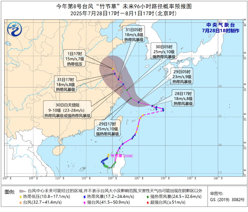 預計,“竹節草”將以每小時20-25公里的速度向西偏北方向移動,即將進入東海東部海面,強度逐漸增強;將於30日白天在浙江三門到江蘇啓東一帶沿海登陸(23-28米/秒,9-10級,熱帶風暴級或強熱帶風暴級),登陸後強度緩慢減弱。也有可能在浙江北部近海北上。