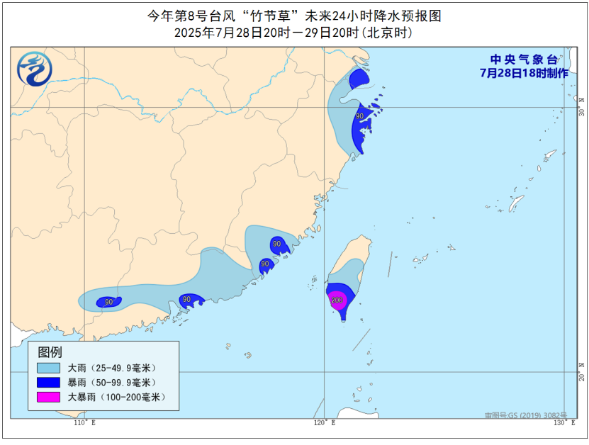 *降水預報:*7月28日20時至29日20時,上海、浙江東部、福建東南部、廣東東部和南部、台灣島等地部分地區有大到暴雨,其中,台灣島南部部分地區有大暴雨(100-200毫米)。上述部分地區伴有短時強降水(最大小時降雨量20-60毫米,局地可超過80毫米)。