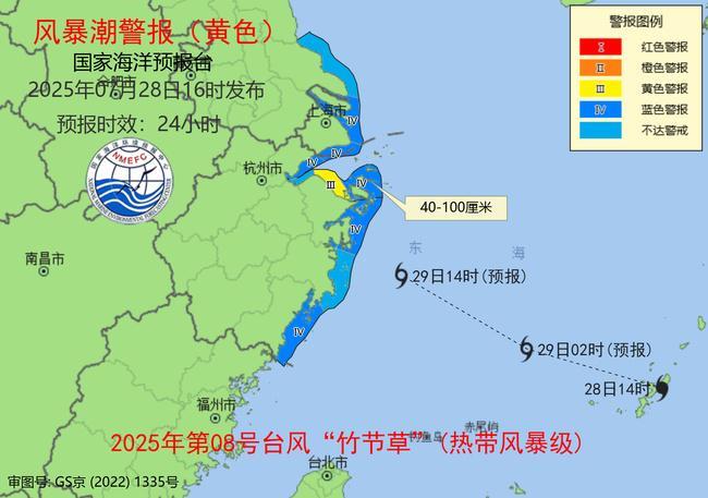 國家海洋預報台7月28日16時發佈風暴潮黃色警報:受今年第8號颱風“竹節草”(熱帶風暴級)的影響,預計:7月28日下午至29日下午,江蘇南通到浙江温州沿海將出現40到100釐米的風暴增水。浙江省寧波市的風暴潮預警級別為黃色,上海市、浙江省嘉興市、舟山市和温州市的風暴潮預警級別為藍色。請沿海政府及相關部門按照職責做好防禦風暴潮的應急準備工作;各涉海相關生產單位採取積極有效的措施,組織漁船、養殖漁排、養殖場等做好防禦工作;加固沿海漁業養殖水產設施和漁港設施,做好防潮準備。