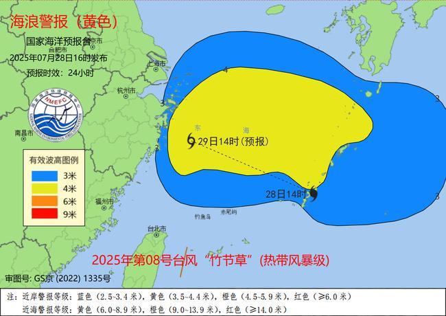 國家海洋預報台7月28日16時發佈海浪黃色警報:受今年第8號颱風“竹節草”(熱帶風暴級)的影響,預計:7月28日夜間到29日白天,東海將出現3.5到5.5米的大浪到巨浪區;上海、浙江北部近岸海域將出現3到4米的大浪到巨浪,該近岸海域海浪預警級別為黃色,江蘇南部、浙江南部近岸海域將出現2到3.4米的中浪到大浪,該近岸海域海浪預警級別為藍色。請在上述海域作業的船隻注意安全,沿海各有關單位提前採取防浪避浪措施。