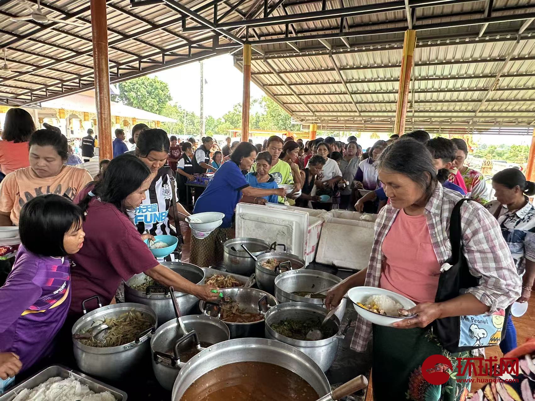 德烏多姆縣最大的安置點設置在一座寺廟裏,約有1200人,記者看到有登記台、管理處、醫療點、物資點等,有政府行政人員和醫生駐點,有泰國王室資助的炊事車,也有當地設置的廚房,廚師都是當地的志願者。中午開飯時,七八樣菜擺在大木台上,有炒雞蛋、炸雞腿、豆腐肉末湯、水果等,民眾有序排隊打飯。
