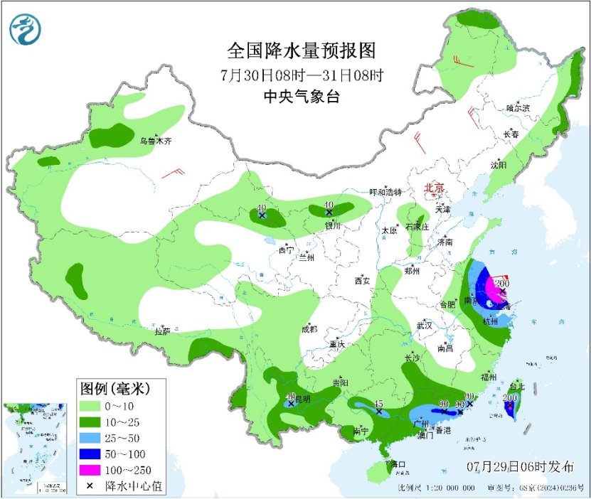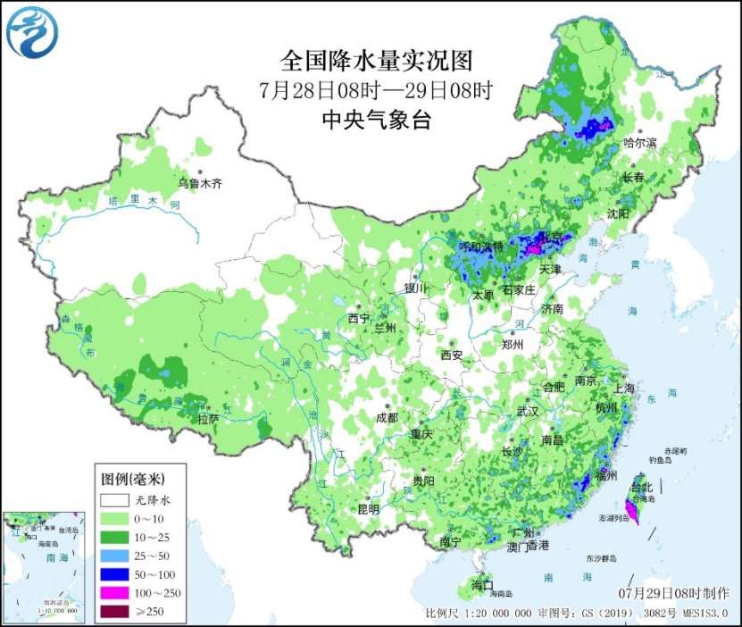 今天,我們主要關注我國東部地區的強降雨情況。其中,京津冀一帶的降雨今日仍將持續,但強度較昨日減弱,總體以中雨為主,部分地區有大到暴雨;內蒙古東部及東北地區降雨發展增強,多地將有大雨或暴雨出現,局地有大暴雨。明天,華北、東北及內蒙古的降雨將趨於結束。此外,未來三天,隨着颱風“竹節草”靠近,華東地區需警惕強降雨,部分地區將有大暴雨,局地有特大暴雨,並伴有短時強降水、雷雨大風或冰雹等強對流天氣。