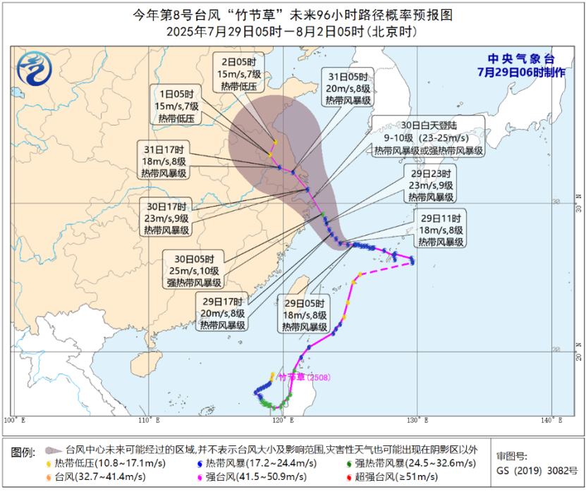 颱風方面,今年第8號颱風“竹節草”(熱帶風暴級)的中心今天早晨5點鐘位於浙江省舟山市東南方向約425公里的東海南部海面,中心附近最大風力有8級(18米/秒)。預計,“竹節草”將以每小時15~20公里的速度向西偏北方向移動,強度逐漸增強;將於30日白天在浙江三門到江蘇啓東一帶沿海登陸(23~25米/秒,9~10級,熱帶風暴級或強熱帶風暴級),登陸後強度緩慢減弱,也有可能在浙江北部近海北上。受其影響,今天,黃海南部、東海大部、杭州灣、長江口區、上海沿海、浙江沿海、江蘇南部沿海將有7~8級、陣風9~10級的大風;颱風中心經過的部分海域或地區風力可達9~10級、陣風11~12級。