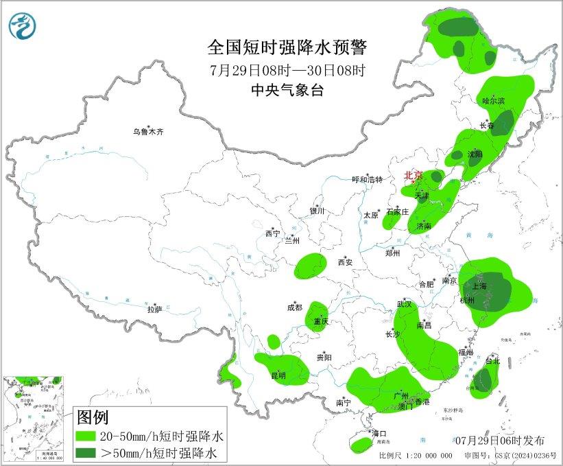 預計7月29日08時至30日08時,東北地區中西部、華北中東部、江淮東南部、江南東北部等地的部分地區將有8級以上雷暴大風或冰雹天氣;內蒙古東北部、東北地區中部、華北東部、黃淮北部、江淮東南部、江南東北部、西南地區東部、華南等地的部分地區將有小時雨量大於20毫米的短時強降水天氣,其中,內蒙古東北部、黑龍江西北部、吉林中東部、遼寧中西部、河北東部、江蘇南部、上海、浙江北部等地的部分地區小時雨量大於50毫米,最大可達80毫米以上。