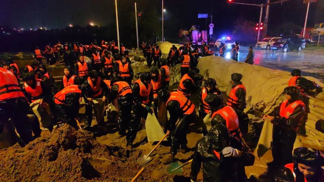 密雲水庫啓動泄洪以來,下游潮河等水位上漲,29日凌晨,武警第一機動總隊某支隊官兵連夜馳援,迅速出動挖掘機,裝載機,照明車等60餘台(套)大型機械裝備,加固潮河兩岸防線。