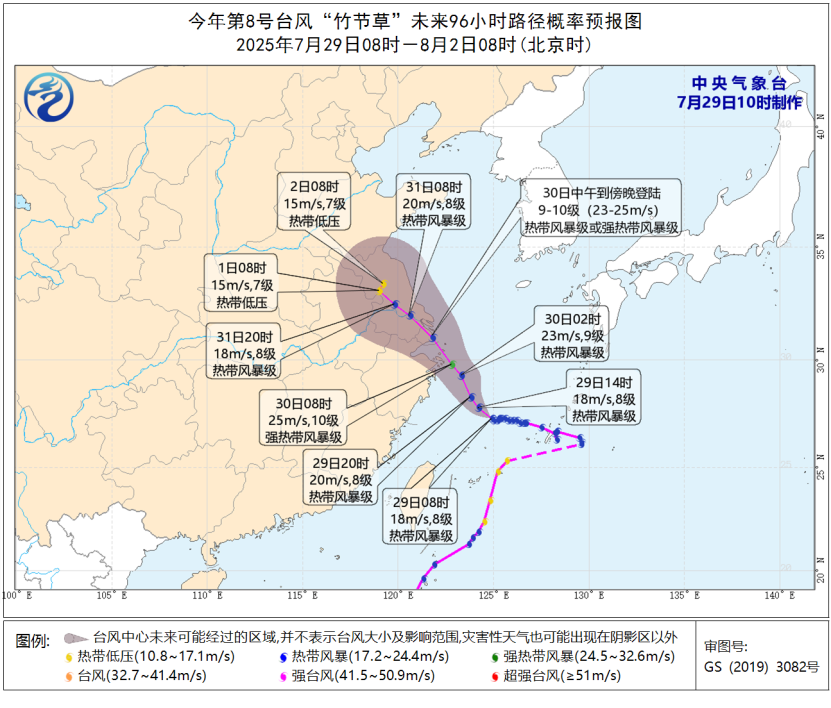 颱風“竹節草”也乘機開始西北行為主,登陸位置向北調整,預計8月上旬將在華東地區上空逐漸消亡。