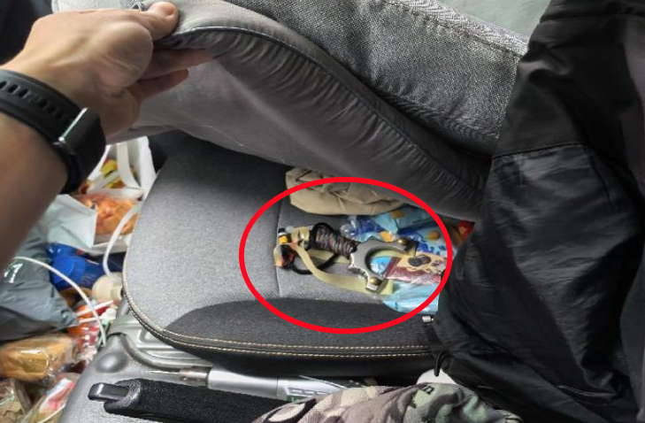 ▲在趙某駕駛車輛的副駕駛車墊下查獲的彈弓和未使用的鋼珠