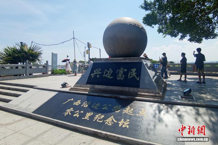 在中國大陸海岸線最西南端,廣西沿邊公路起點零公里紀念壇穩穩地矗立在北侖河入海口處,紀念壇上的“興邊富民”四個大字赫然醒目,這裏既是廣西沿邊公路的開端,也是國道219線的“零公里”處,它見證着一條公路如何讓邊陲村落——竹山村煥發新生。