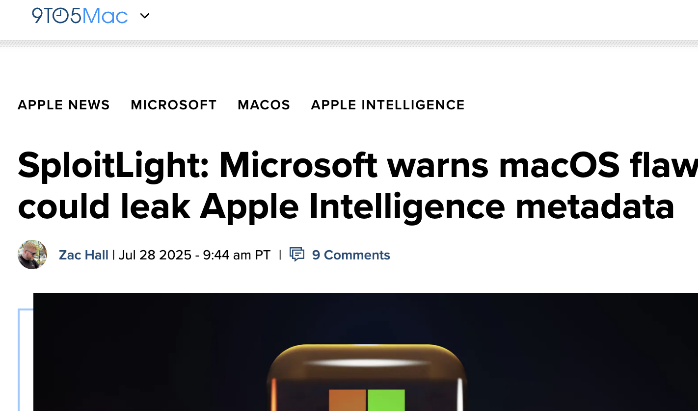 【環球網科技綜合報道】7月29日消息,據9to5mac報道稱,微軟安全團隊發佈技術博文,公開代號“SploitLight”的 macOS 漏洞詳情,並確認蘋果已於 2025 年 3 月 31 日通過 macOS Sequoia 安全更新(CVE-2025-31199)完成修復。