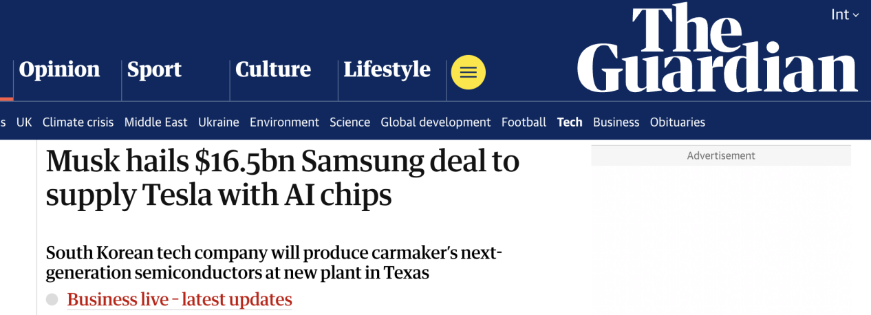 【環球網科技綜合報道】7月29日消息,據《衞報》報道稱,三星電子在監管文件中宣佈,已與特斯拉簽署價值約165億美元的半導體供應協議,將在其位於德克薩斯州泰勒的新工廠為特斯拉下一代AI6芯片提供代工服務。