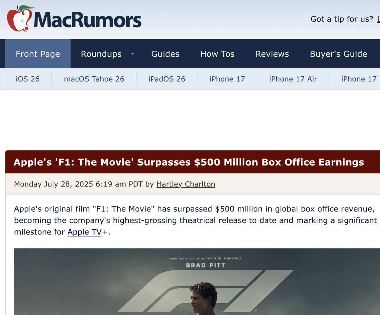 【環球網科技綜合報道】7月29日消息,據macrumors報道稱,蘋果公司原創電影《F1:大電影》全球票房已突破 5.09 億美元,成為 Apple 迄今最賣座的院線作品。