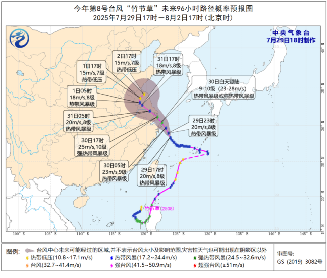 此外,受“竹節草”影響,7月29日至30日,我國華東沿海地區將出現6至8級、陣風9至10級的大風,在台風中心經過的部分海域或地區風力可達9至10級、陣風11至12級。江蘇東南部、浙江東北部、上海等地也將出現5至7級、陣風8至9級的大風。