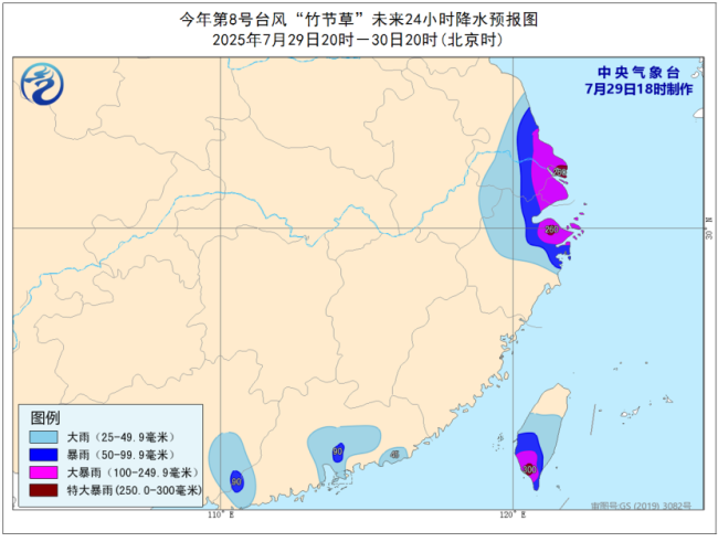 陳濤表示,受颱風“竹節草”影響,我國華東地區將出現大範圍強降水。7月29日20時至30日20時,江蘇中南部、上海、浙江中北部、廣東中南部、廣西東部、台灣島等地部分地區有大到暴雨,其中,江蘇東南部、上海、浙江東北部、台灣島南部等地部分地區有大暴雨,局地特大暴雨。