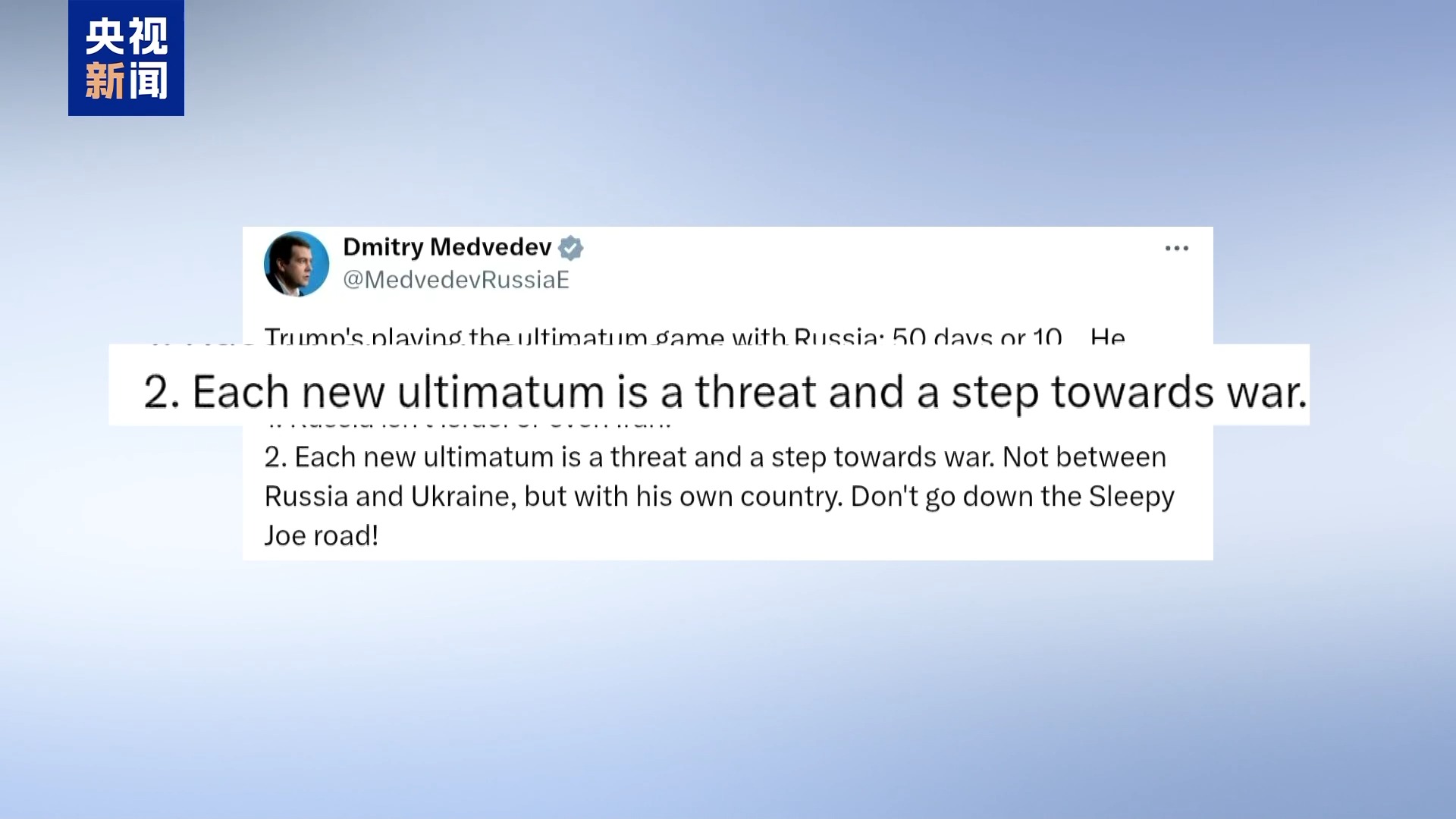 對此,俄羅斯聯邦安全會議副主席梅德韋傑夫在社交平台發文回應:特朗普正在與俄羅斯玩所謂“最後通牒”的遊戲,但我希望他記住,每一則“最後通牒”都構成威脅,將讓美俄關係惡化,甚至走向戰爭。此後,梅德韋傑夫再次強調,美方無人有資格決定俄羅斯何時“坐上談判桌”。