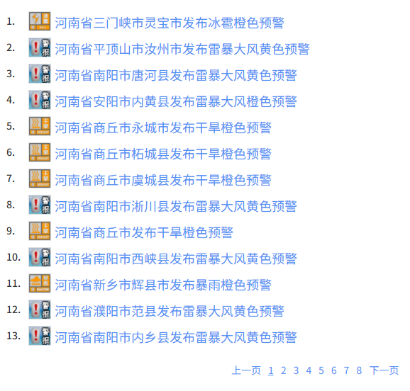 但這遠非全部。就在同一天,濟源、三門峽的靈寶和盧氏等地響起了冰雹預警;平頂山汝州、南陽唐河等地則被雷暴大風“突襲”,掛出24條預警;而商丘的永城、柘城等地,卻在與乾旱抗爭。