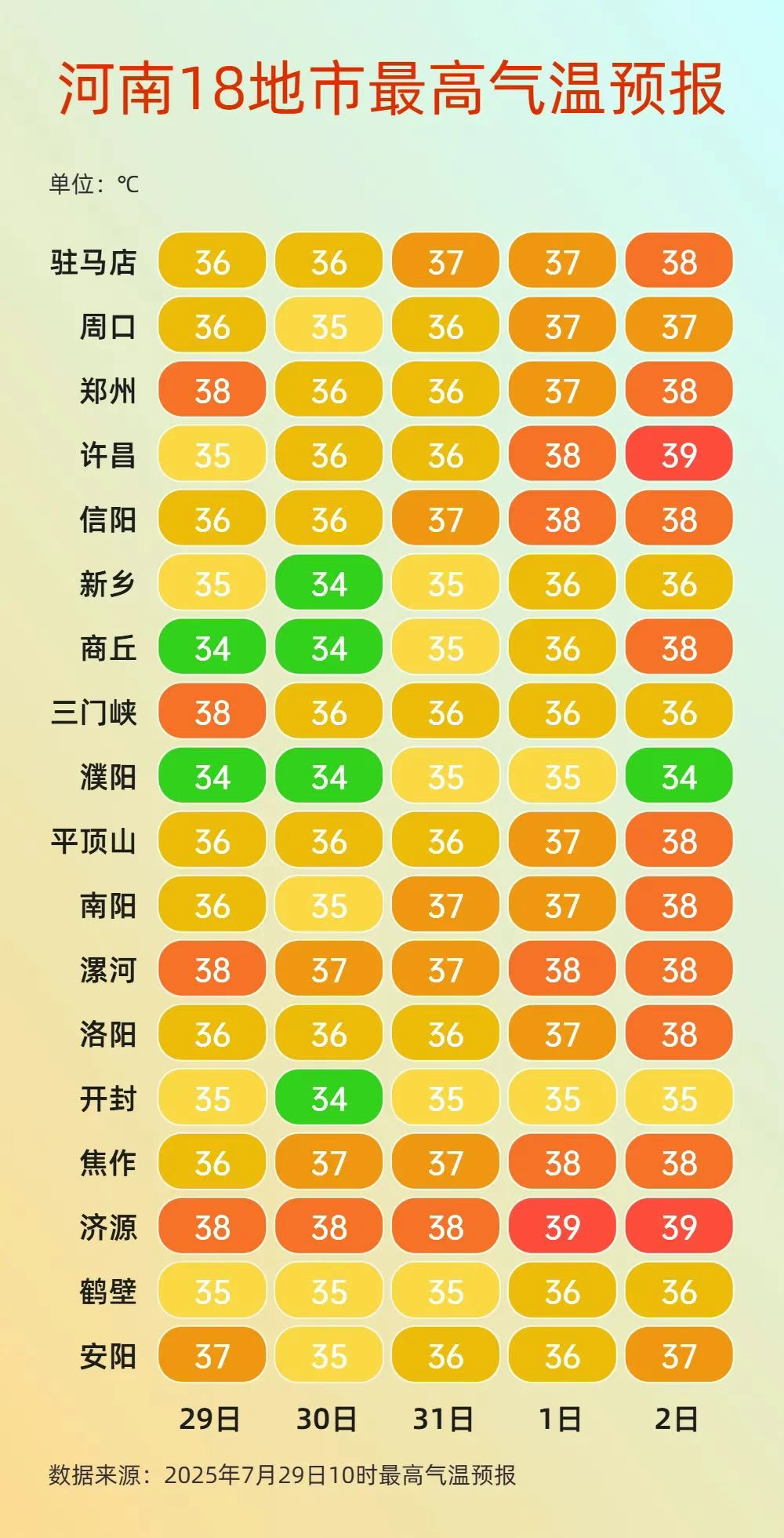 高温,依舊牢牢佔據着天氣舞台的中心。河南省氣象台預計,未來五天,我省大部地區的晴熱天氣將是常態,35℃是基礎線。尤其是我省西北部和南部,將成為熱浪的中心區域,最高氣温將直衝37至39℃。這串數字,對每一個在户外奔波的人來説,分量不輕。