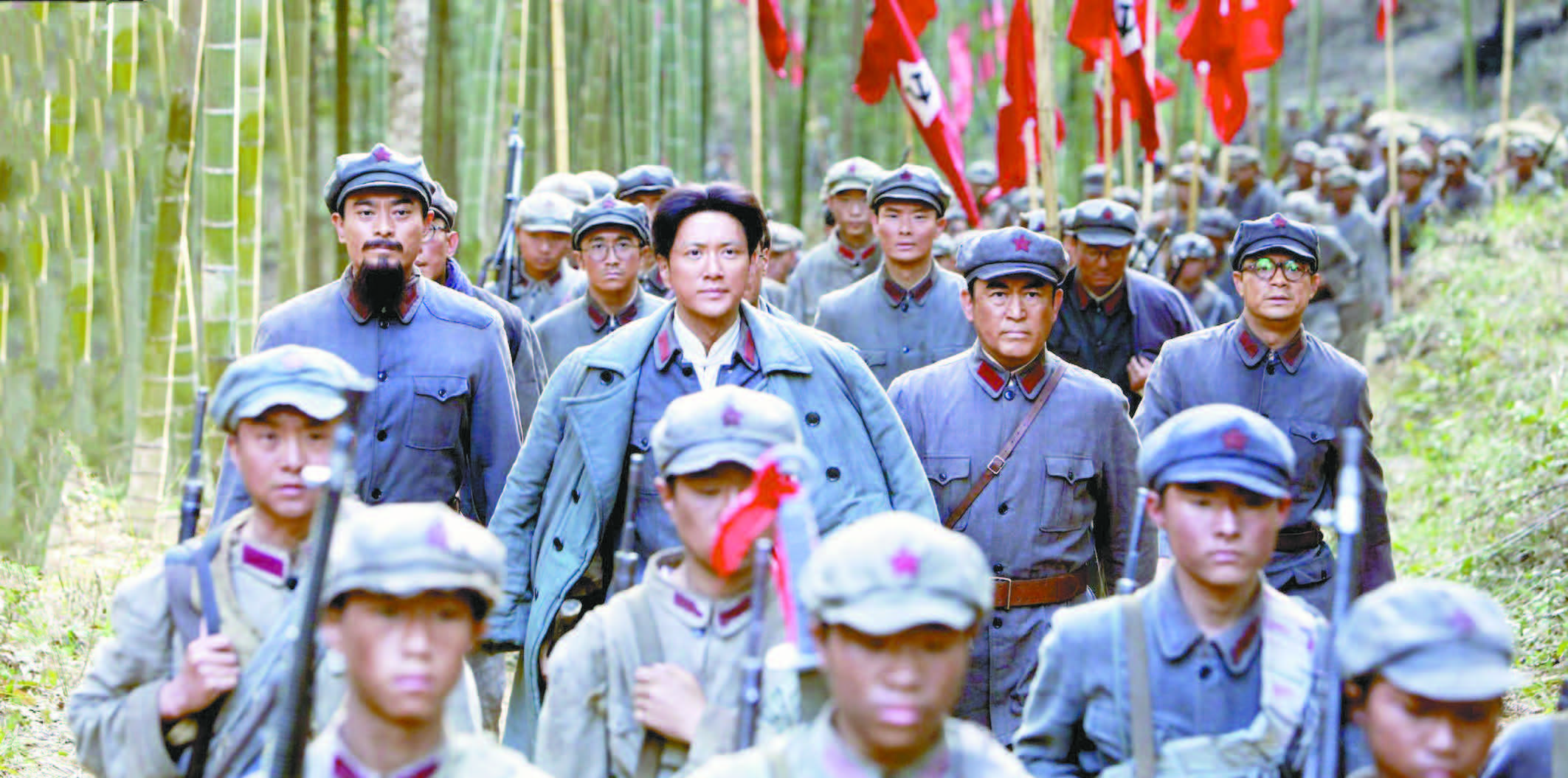 *王仁君:*跟橫店這種易拆卸、空間大的影視基地拍攝相比,實景拍攝對攝製組來説困難很大。比如我們在蘇家坡一個不足6平方米的祠堂拍戲時,這麼狹小的空間裏3台機器一架,拍攝期間演員很難出去,所以我拍攝前會先上廁所。那為什麼還要堅持這種實景拍攝?因為演員在這種環境中的信念感是不一樣的。我真切地感受到,先輩們就是在這樣的條件下幹出了開天闢地的事業。《古田軍號》裏,主席説“最愛聽人叫我先生”的片段,在B站刷滿“先生好想你”的彈幕,年輕觀眾的情感共鳴讓我們主創淚目。