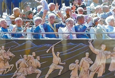2015年9月3日,紀念中國人民抗日戰爭暨世界反法西斯戰爭勝利70週年閲兵儀式上,抗戰老兵方隊中的翟維俊(前排左四)。圖為受訪者提供