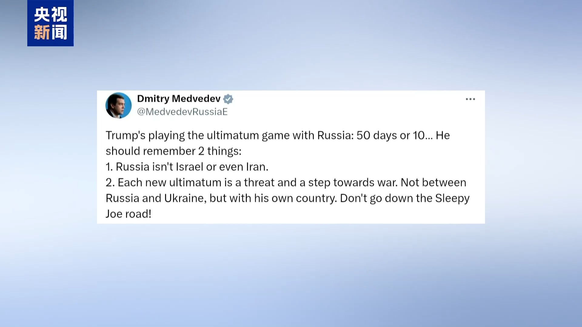 對於特朗普此番言論,俄羅斯安全會議副主席梅德韋傑夫表示,特朗普在和俄羅斯玩“最後通牒”的遊戲,不管是50天還是10天。每一次新的最後通牒都是一種威脅,是邁向戰爭的一步。