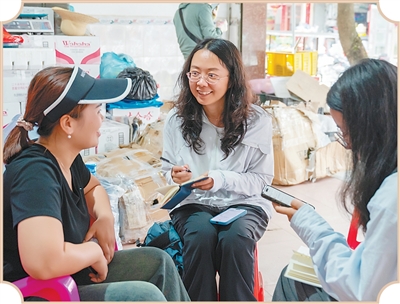 本報記者採訪在那坡經營水果生意的越南商户(左一)。