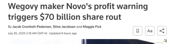 諾和諾德表示,將按固定匯率計算的全年銷售增長預期從13%-21%下調至8%-14%,營業利潤增長預期從16%-24%下調至10%-16%。受此消息影響,公司股價當日下跌28%,市值蒸發約930億美元。美國存託憑證(ADR)收盤下跌21.81%,報53.94美元。