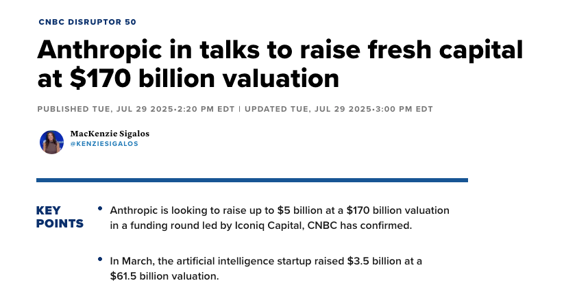 據悉,僅2025年上半年,Anthropic已籌集超35億美元資金,而本輪30-50億美元的融資規模,甚至超過多數AI獨角獸的累計融資總額。