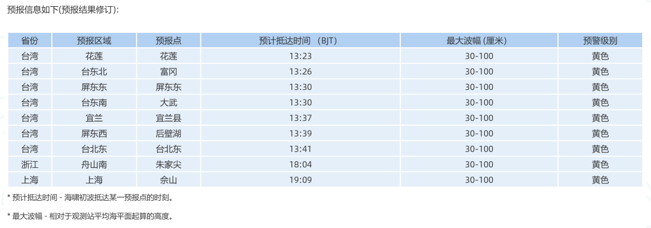 經自然資源部海嘯預警中心綜合分析研判,此次地震已引發越洋海嘯,預計海嘯波將於13:30到達台灣沿岸,17-19點左右到達浙江、上海沿岸,最大波幅分別為60、40和30釐米。目前,颱風"竹節草"正在浙江省境內移動,預計將在浙江、上海等沿海地區引發100釐米左右的風暴增水。海嘯與颱風雙重災害影響,沿海地區務必高度警惕,做好防災減災工作。