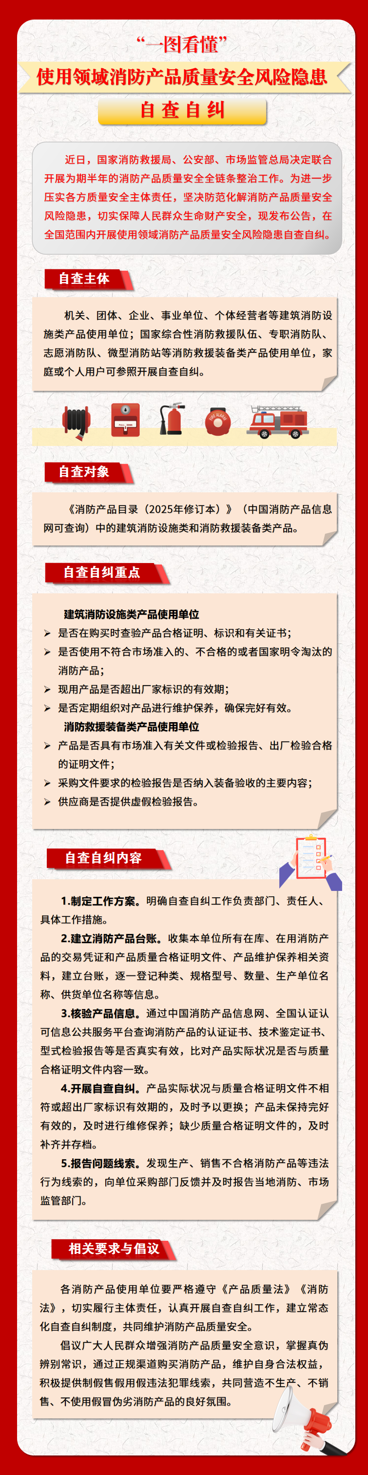 據悉,此次整治聚焦手提式滅火器、過濾式消防自救呼吸器、灑水噴頭、防火門等20餘種與社會公眾安全和滅火救援成效關聯密切的產品,覆蓋生產、流通、使用、認證檢驗等領域。
