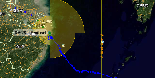 中央氣象台7月30日10時繼續發佈颱風黃色預警: 預計,“竹節草”將以每小時15公里左右的速度向北偏西方向移動,強度變化不大,將於今天(30日)傍晚前後在浙江平湖到江蘇啓東一帶沿海再次登陸(23-28米/秒,9-10級,熱帶風暴級或強熱帶風暴級),最大可能在上海金山到浦東一帶沿海登陸, 登陸後強度逐漸減弱。