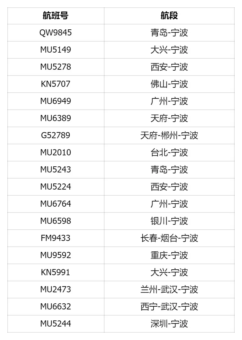 截至7月29日21時2分,寧波機場7月30日取消的航班如下: