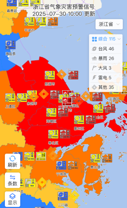 截至10:00,浙江已發佈115條氣象災害預警信號。