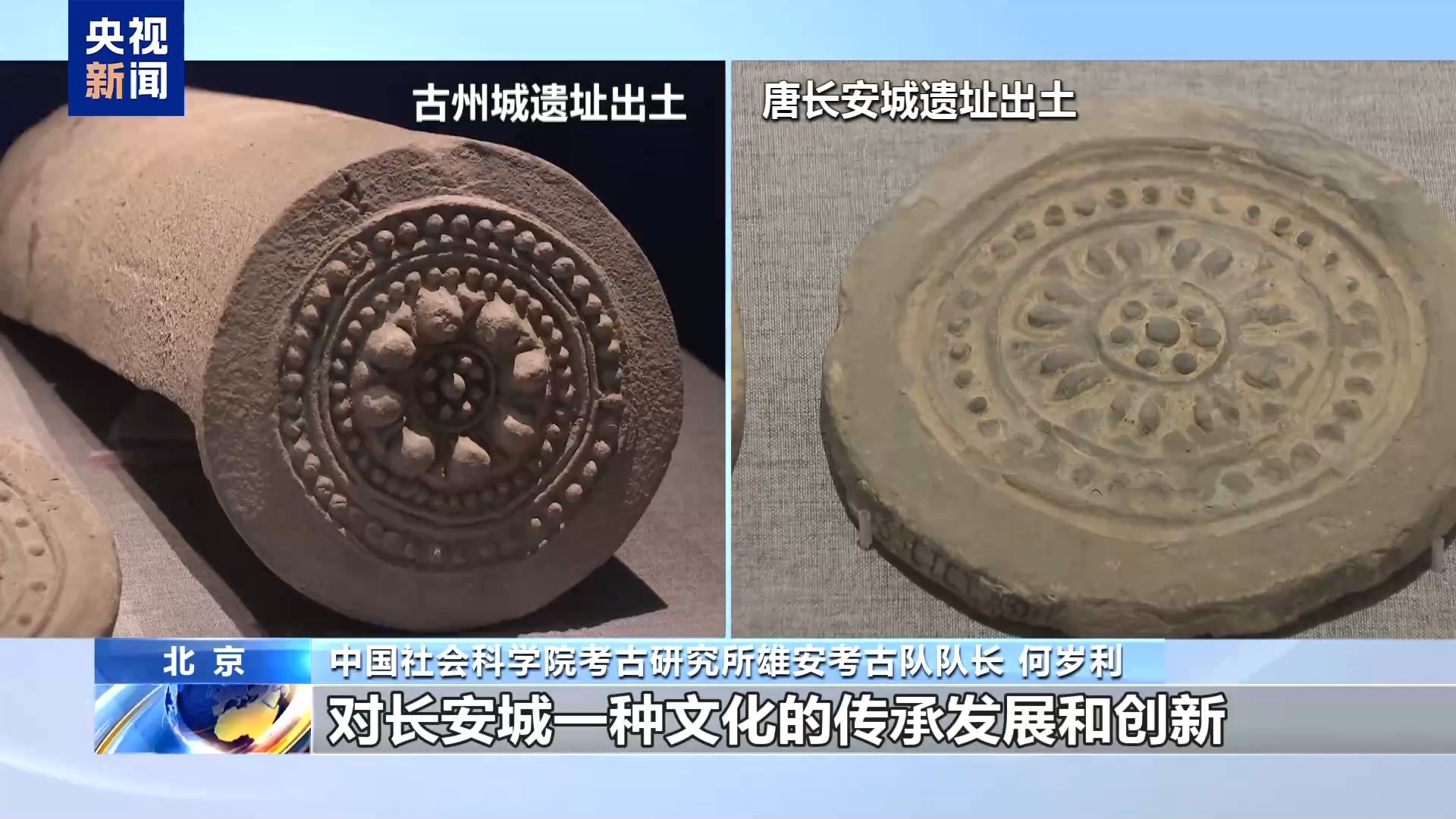 中國社會科學院考古研究所雄安考古隊隊長 何歲利:從整體的佈局來説,跟長安城出土的蓮花紋瓦當大同小異,都是核心是蓮蓬,外圍是蓮瓣,再外圍是聯珠紋。但是古州城出土的瓦當出現了兩圈的聯珠紋,也説明在建築材料的製作上,對長安城一種文化的傳承、發展和創新,也展示出大國一統的局面。