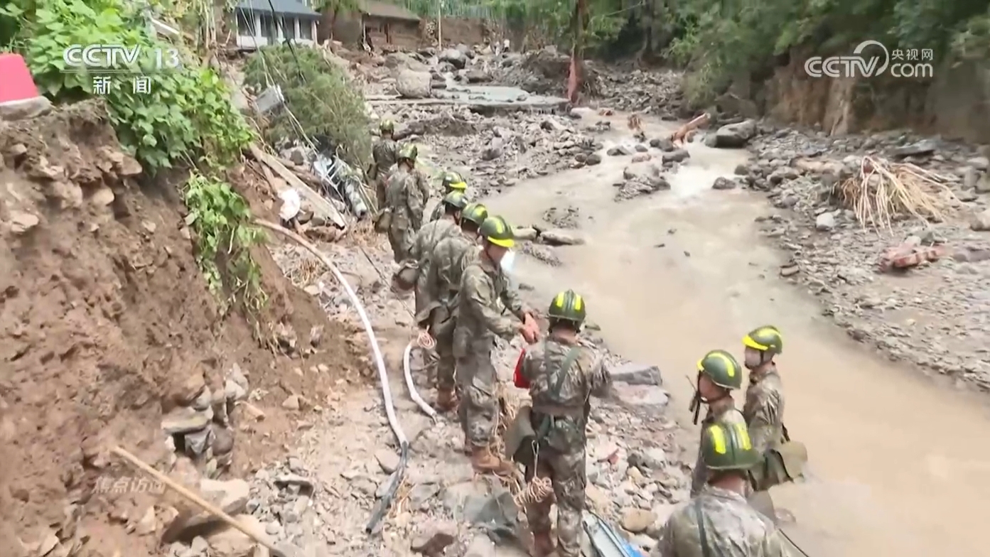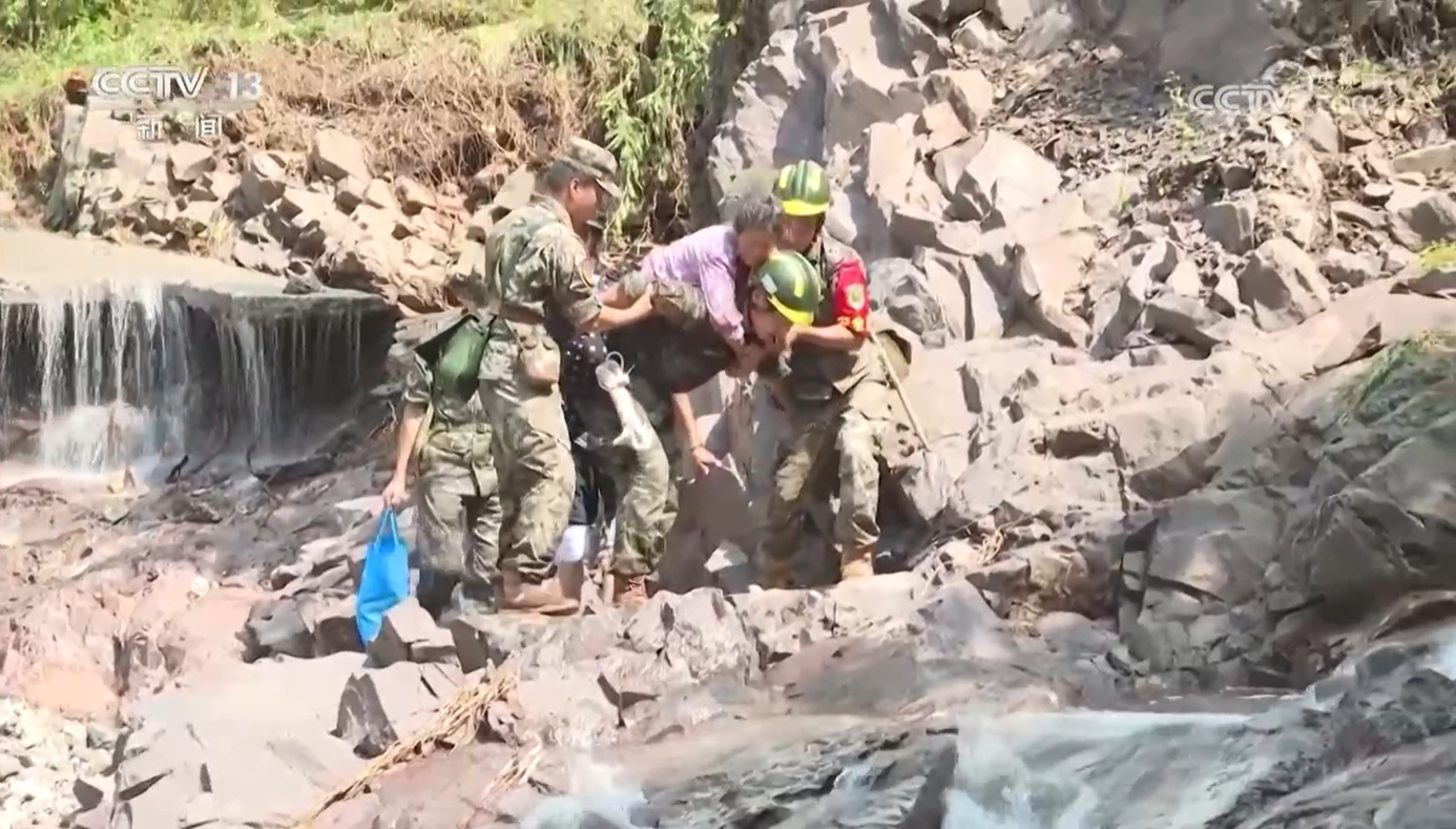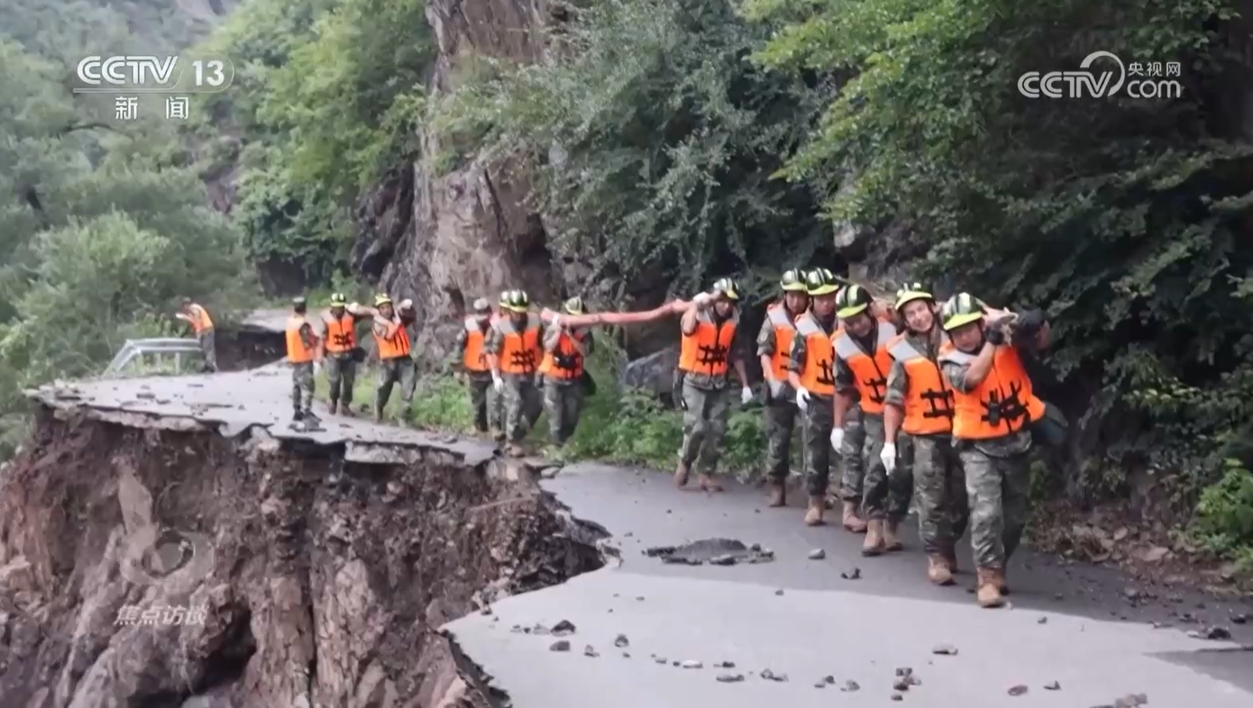 官兵們沿着河道摸索前進,出發不久後就遇到了斷崖,他們用繩索索降的方式,成功突破了懸崖障礙。經過兩個小時的艱難前行,兩組徒步挺進的官兵先後到達失聯的桃條溝村。官兵們採取擔架轉運、交替接力、攙扶前行的方式緊急轉運被困人員。
