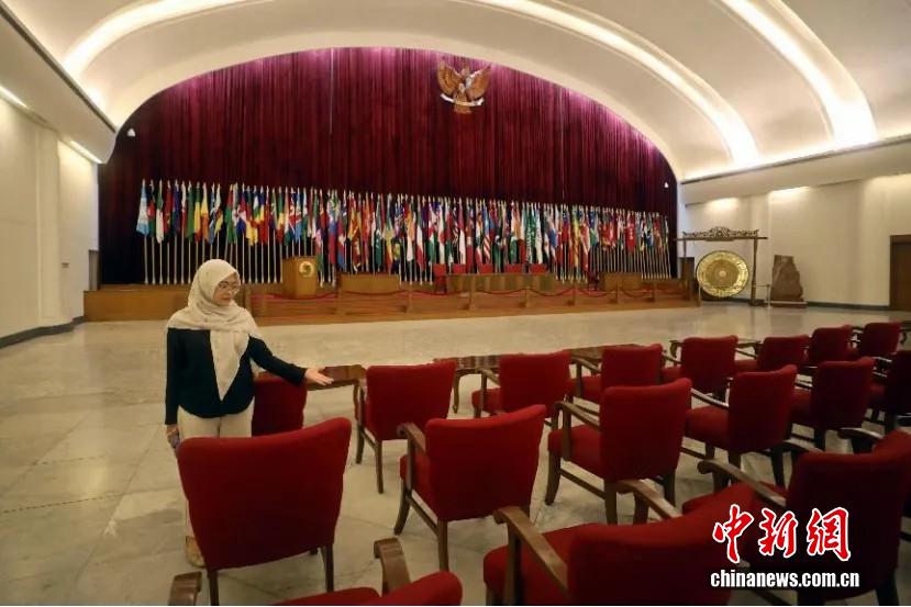 當地時間2025年3月18日,在萬隆亞非會議紀念博物館內,工作人員展示中國代表團在1955年萬隆會議上的座席區域。 中新社記者 李志全 攝