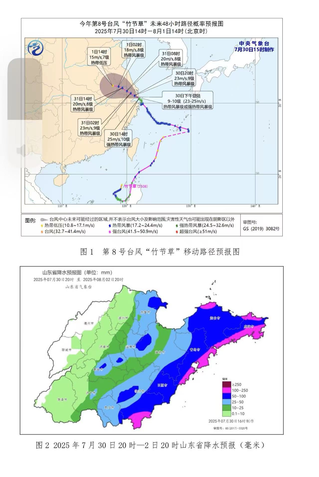 *降雨:*30日夜間颱風“竹節草”外圍雲系開始影響山東,強降水落區位於山東中東部地區,主要集中在31日白天至8月1日白天,伴有短時強降水、雷電和8~10級雷雨陣風,最大1小時降水量60~100毫米,全省累積平均降水量20~40毫米。