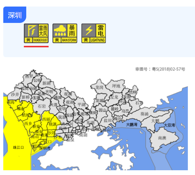 【深圳市分區雷雨大風黃色預警信號】深圳市氣象台2025年07月30日17時55分發布南山區、珠江口、深圳灣和寶安區(福永、西鄉、新安、航城、福海街道)雷雨大風黃色預警信號,預計1-2小時內陣風將達8級以上,並伴有強雷電。請落實各項防風防雷電措施。