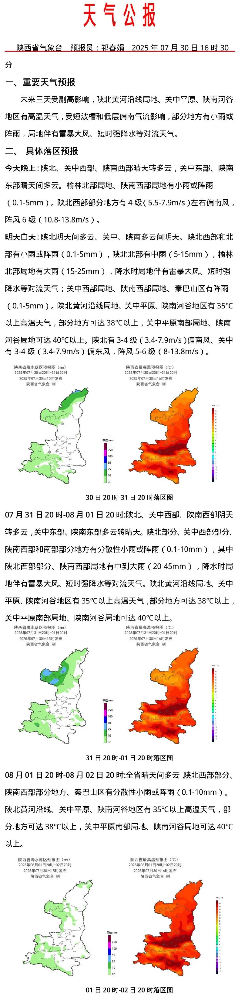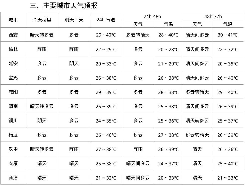 未來三天受副高影響,陝北黃河沿線局地、關中平原、陝南河谷地區有高温天氣,受短波槽和低層偏南氣流影響,部分地方有小雨或陣雨,局地伴有雷暴大風、短時強降水等對流天氣。