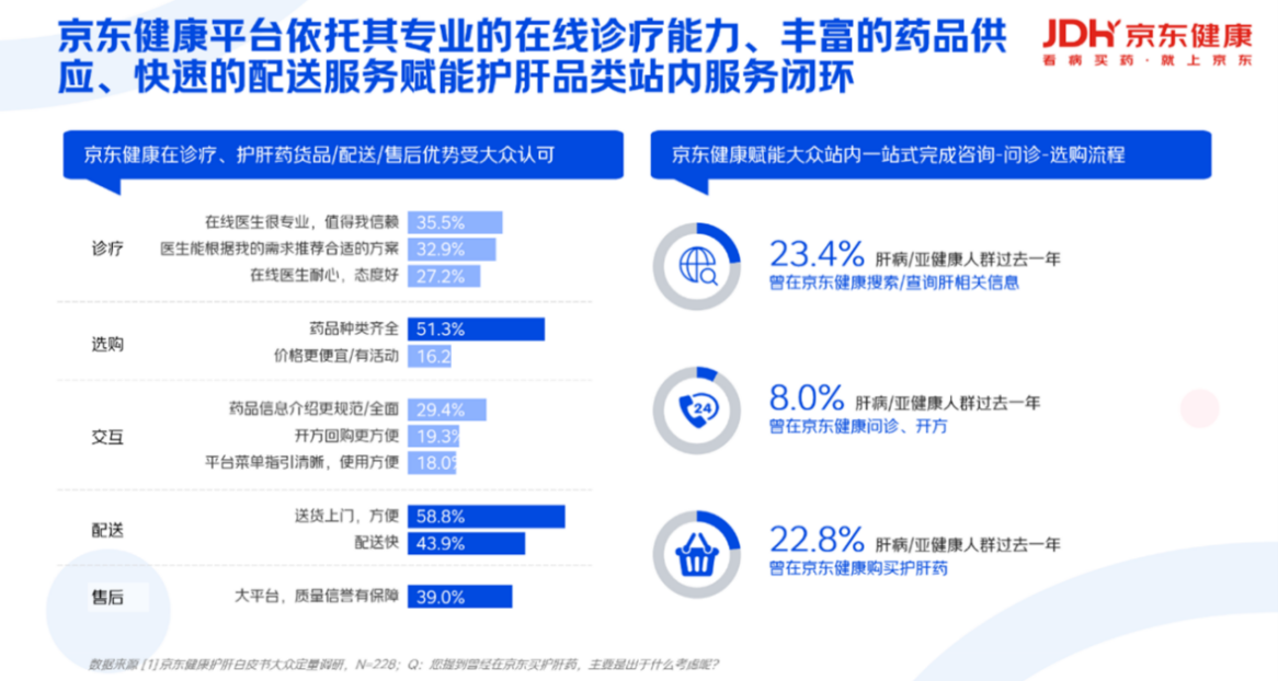 依託在線診療能力、藥品供應及配送時效,京東健康已實現護肝品類“諮詢-問診-買藥-隨訪”一站式閉環服務。數據顯示,35.5%的用户認可在線醫生專業度,51.3%認為藥品種類齊全,58.8%滿意送貨上門服務;過去一年,有23.4%的肝病/亞健康人羣曾在京東健康查詢肝相關信息,8.0%進行過問診開方,22.8%購買過護肝藥。