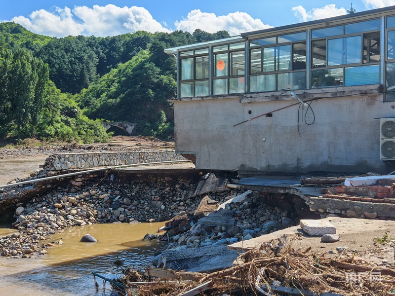 走過老公營村便到了偏道子村,牆壁上依舊能看到洪水衝擊的痕跡,靠近河邊的村民家裏淤泥有幾十釐米厚,有村民正在收拾東西準備轉移,還有一些村民已經收拾好,等待通車後乘車出去。偏道子橋被洪水攔腰截斷,只剩半截殘留在對岸,被洪水席捲的樹枝堆在上面,前一天由村民和消防員合力搭建的兩段木橋成為唯一通道。