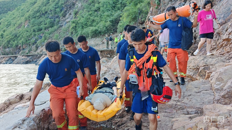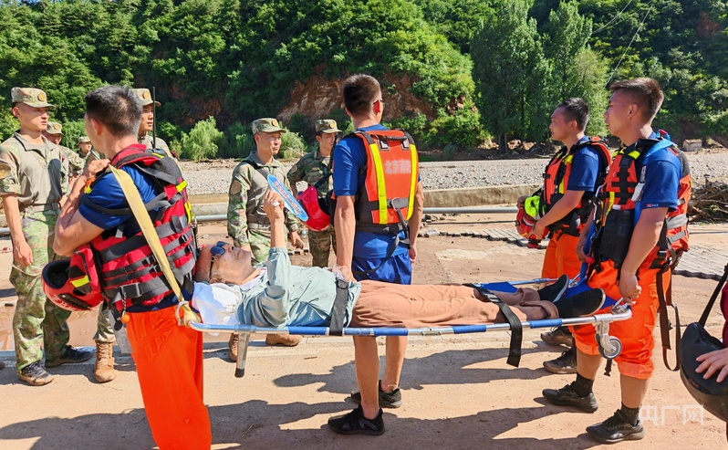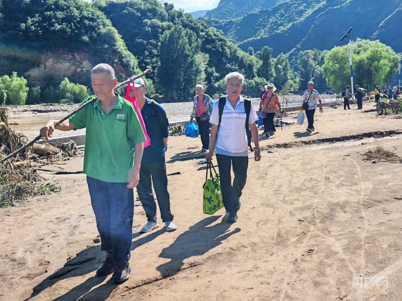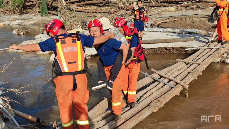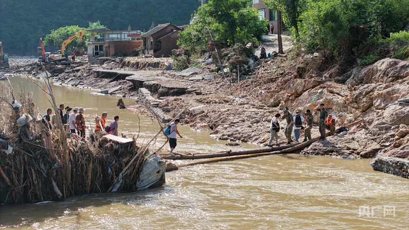 7月28日,消防救援力量率先突破,進入碾子灣村運送物資並轉移羣眾。從琉璃廟鎮前往碾子灣要經過三處橋樑,這些橋樑全部被洪水沖毀,救援人員只能就地取材,利用被洪水衝倒的樹木和繩索在後河套村搭建木橋,打通通往碾子灣村的生命救援線。當天,消防人員累計轉移被困遊客和村民170餘人。“那浮橋晃得厲害,可沒人敢停步。”一位參與轉移的村民回憶道。洪水退去的河岸,還留着被捲走車輛的殘骸。