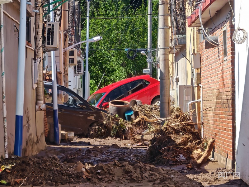 車輛在兩排房子中間通道處相撞卡在中間,雜物、樹木、淤泥堆疊在一起(央廣網記者 龐婷 攝)
