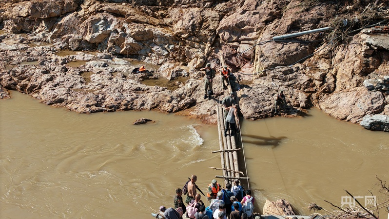 村民從臨時搭建的木橋處轉移出村(央廣網記者 朱冠安 攝)