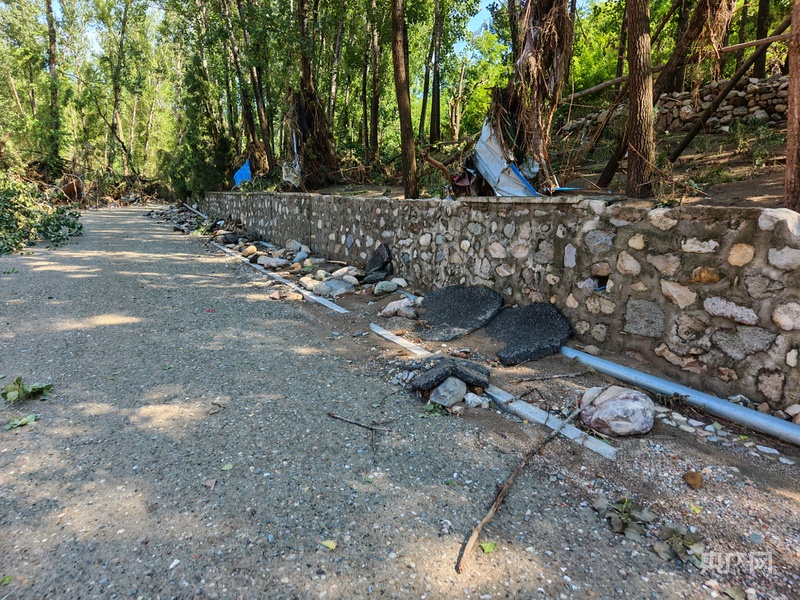 下午兩點半,隊伍繼續行進,柏油路已被洪水“啃”得精光,裸露的地基間嵌着碎石。“前面7公里到村委會。”王起春指着路側樹林,聲音發澀地説:“暴雨來臨時,有遊客的車輛被沖走,車裏的人破窗逃出,抱着高處的大樹苦苦支撐6個小時才脱離危險。”