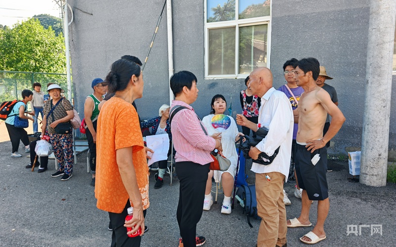 等待轉移的村民和村書記王起春(右二)説着自己家的情況(央廣網記者 龐婷 攝)