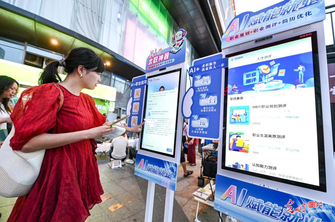日前,江西省南昌市青雲譜區徐家坊街道舉辦“洪漂人才薈”夏季夜市招聘會。活動以“夜市+招聘”模式,融入AI賦能,搭建智能化就業對接平台,吸引了周邊社區居民、商圈從業者、學生等羣體參與,累計進場求職人數超800人次。圖為應聘者在體驗AI簡歷優化服務。(鮑贛生攝/光明圖片)