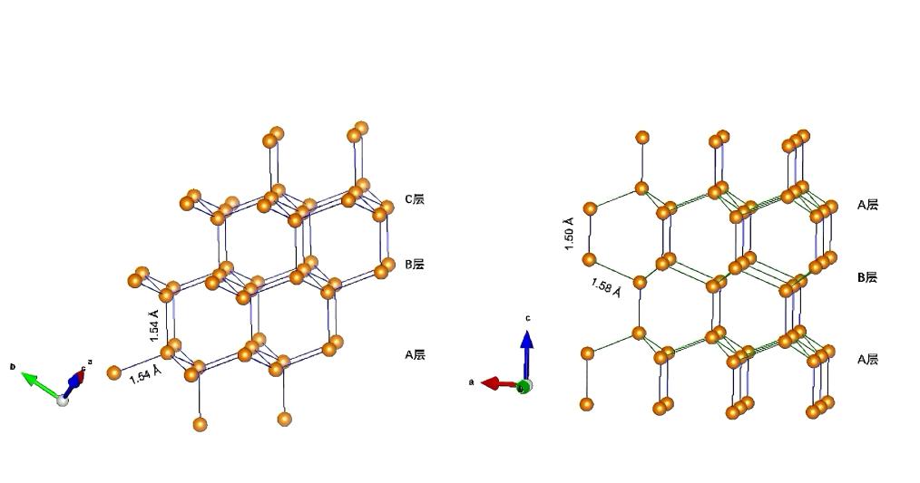 左圖為常見金剛石的碳原子結構排列,右圖為六方金剛石的碳原子排列。(受訪者供圖)