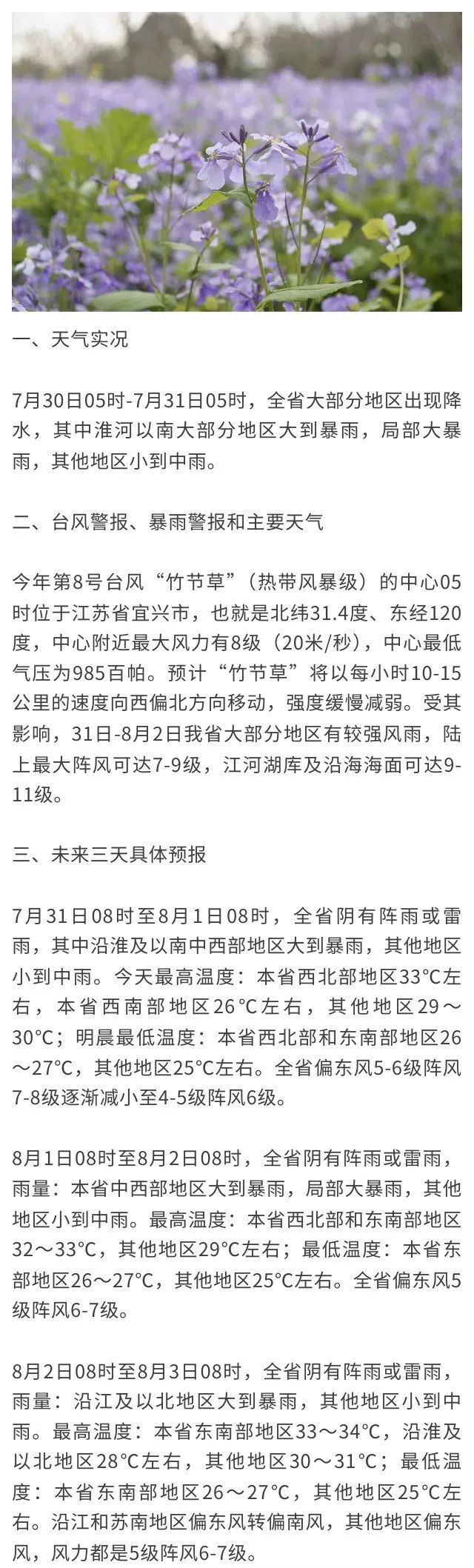 預計,“竹節草”將以每小時10-15公里的速度向西偏北方向移動,31日晚上移入安徽東部地區,之後徘徊少動,強度逐漸減弱。