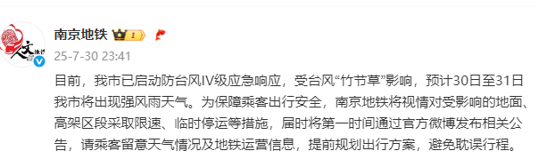 南京地鐵:目前,南京市已啓動防颱風IV級應急響應,受颱風“竹節草”影響,預計30日至31日南京市將出現強風雨天氣。為保障乘客出行安全,南京地鐵將視情對受影響的地面、高架區段採取限速、臨時停運等措施,屆時將第一時間通過官方微博發佈相關公告,請乘客留意天氣情況及地鐵運營信息,提前規劃出行方案,避免耽誤行程。