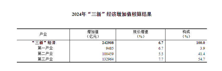 經核算,2024年我國“三新”經濟增加值為242908億元,比上年增長6.7%(按現價計算),比同期國內生產總值(GDP)現價增速高2.5個百分點;*佔GDP的比重為18.01%,*比上年提高0.43個百分點。