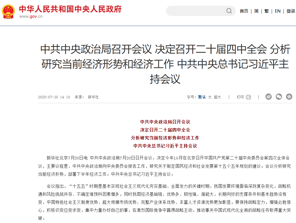 【環球網財經綜合報道】7月30日,中共中央政治局召開會議,決定今年10月召開黨的二十屆四中全會,研究關於制定“十五五”規劃的建議。會議分析研究當前經濟形勢,部署下半年經濟工作。會議釋放財政政策、貨幣政策、資本市場、內需提振、風險化解等多方面的重大信號,為下半年經濟工作指明方向。